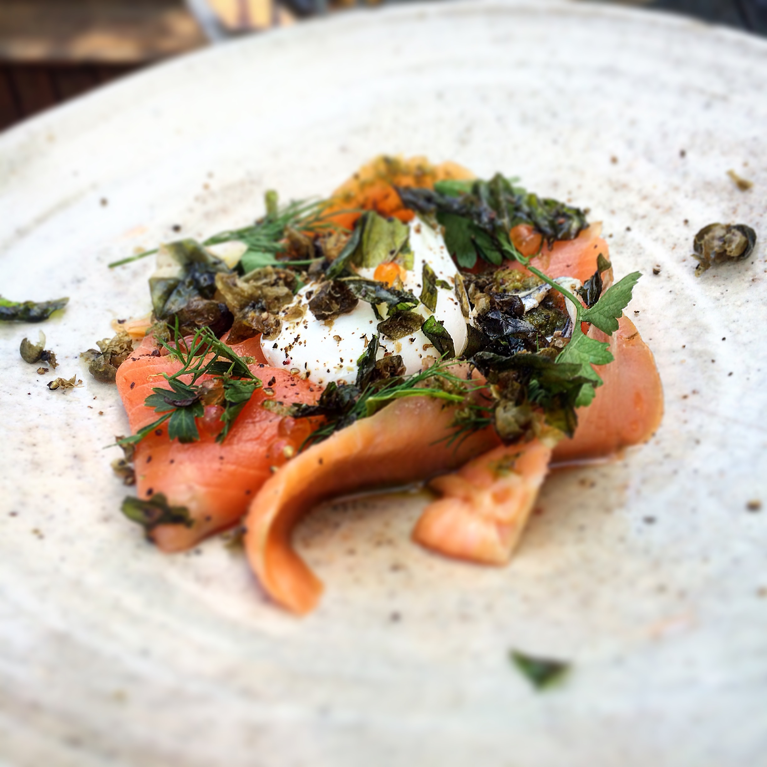 Posted on May 9, 2016 by Jacqui's Food Fetish Leave a comment Manuka smoked ora king salmon, a poached egg, salmon pearls, soft herbs, served with wattle seed blini