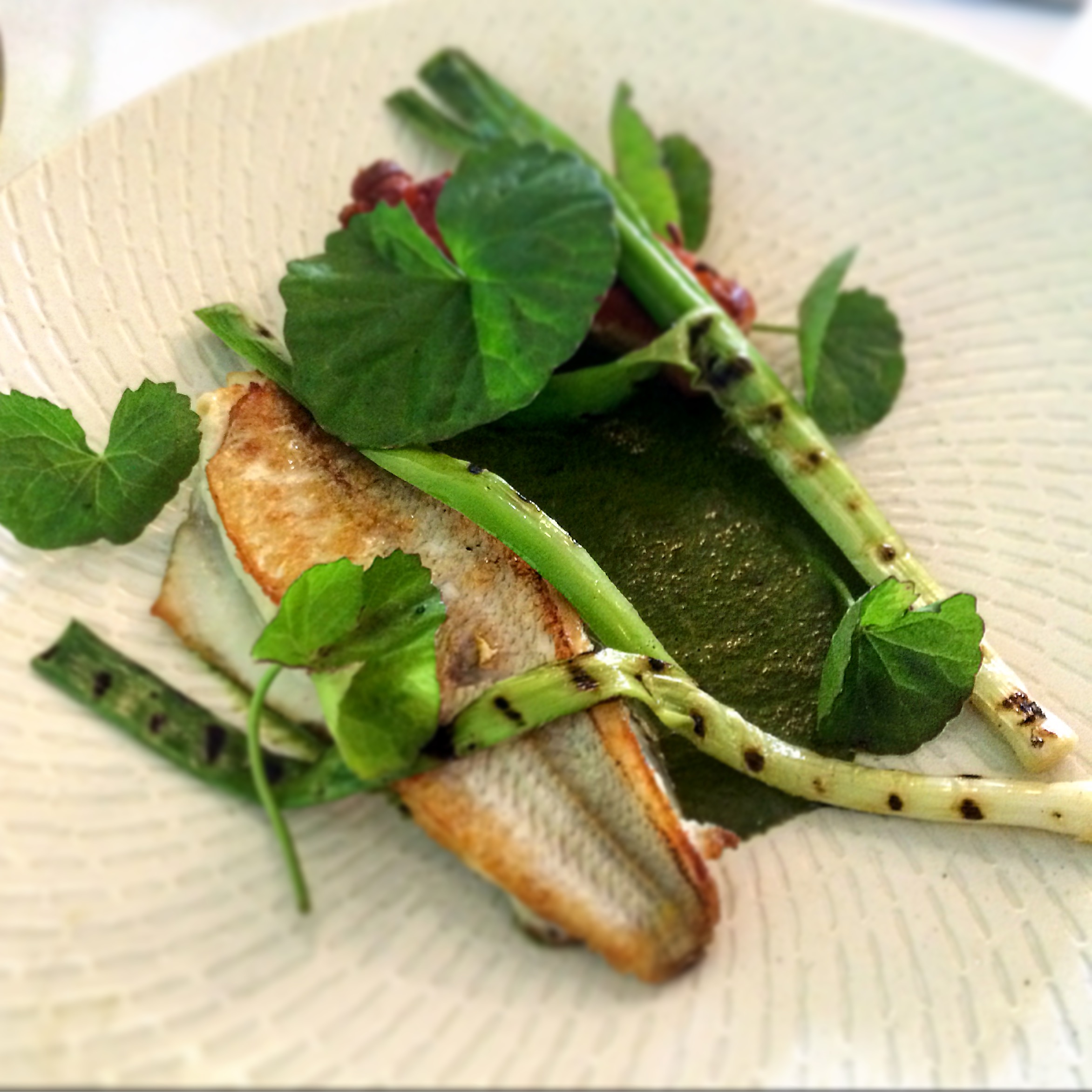 Posted on March 8, 2016 by Jacqui's Food Fetish Leave a comment Sand whiting, caramelised octopus, warrigal greens, grilled baby leeks, centella leaves