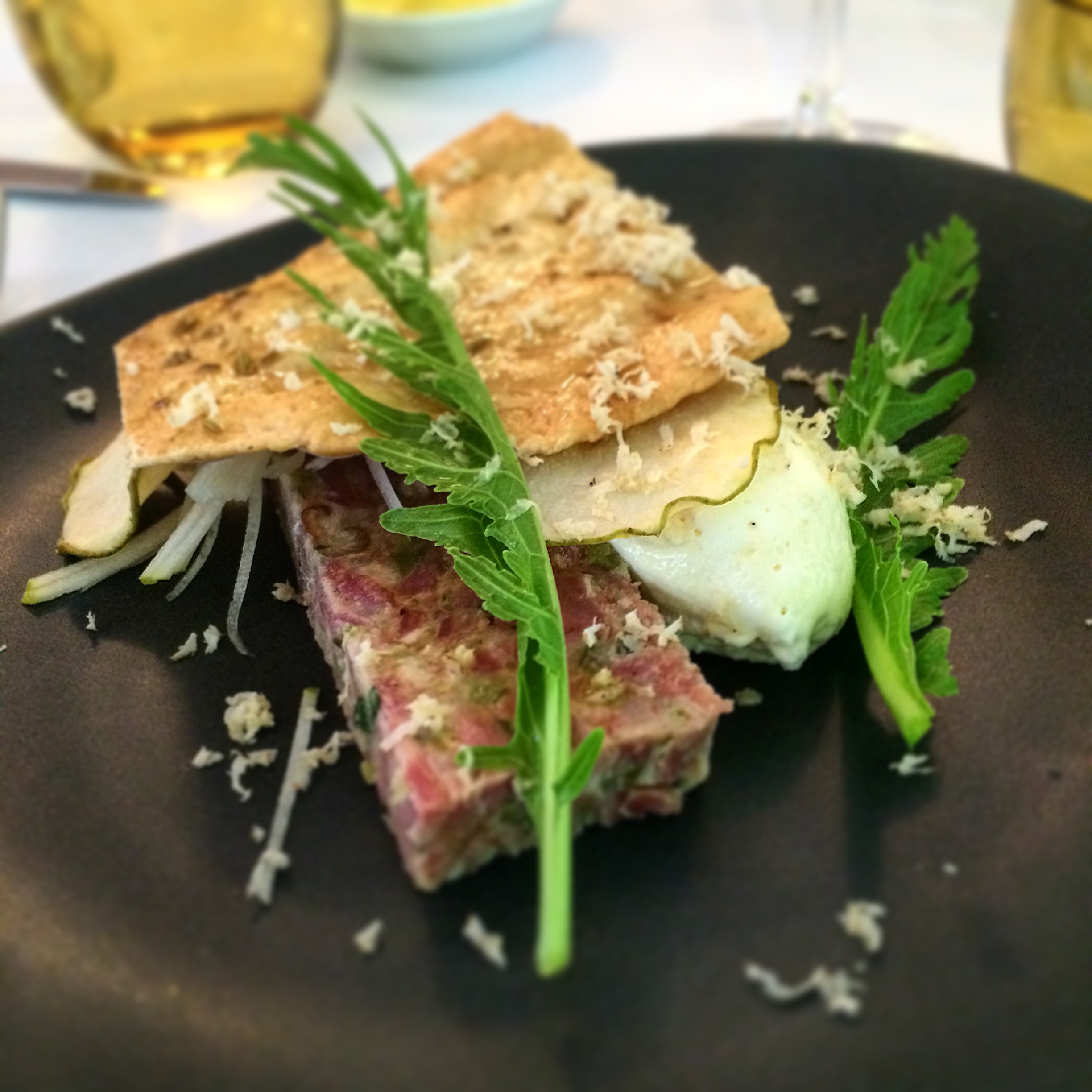 Posted on March 8, 2016 by Jacqui's Food Fetish Leave a comment Pork hock persillade, caramelised apple mousse, horseradish pears and fennel seek bark
