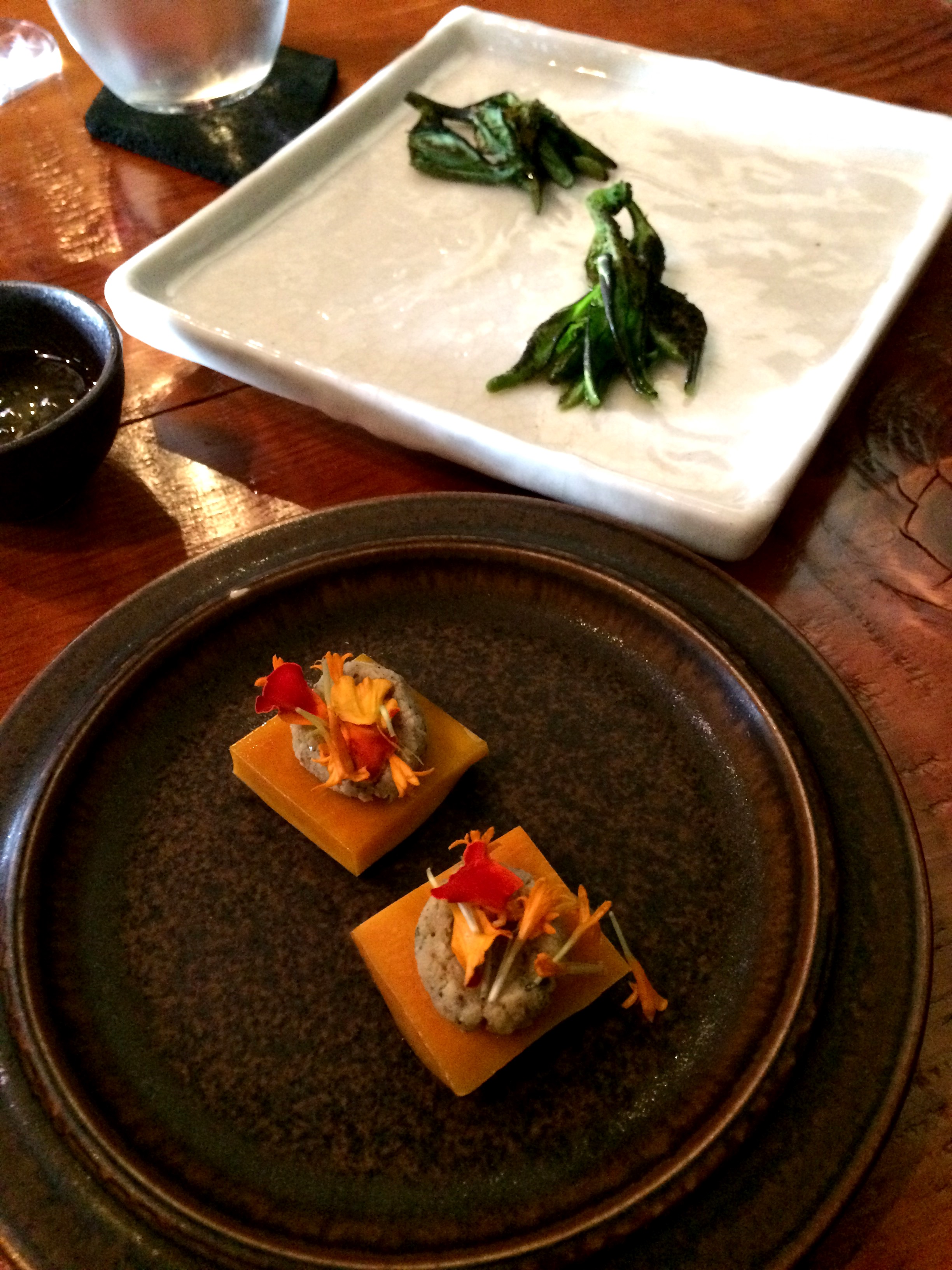 Posted on March 1, 2016 by Jacqui's Food Fetish Leave a comment Warrigal greens with vinaigrette powder and lightly pickled pumpkin skins with nut cheese and marigold
