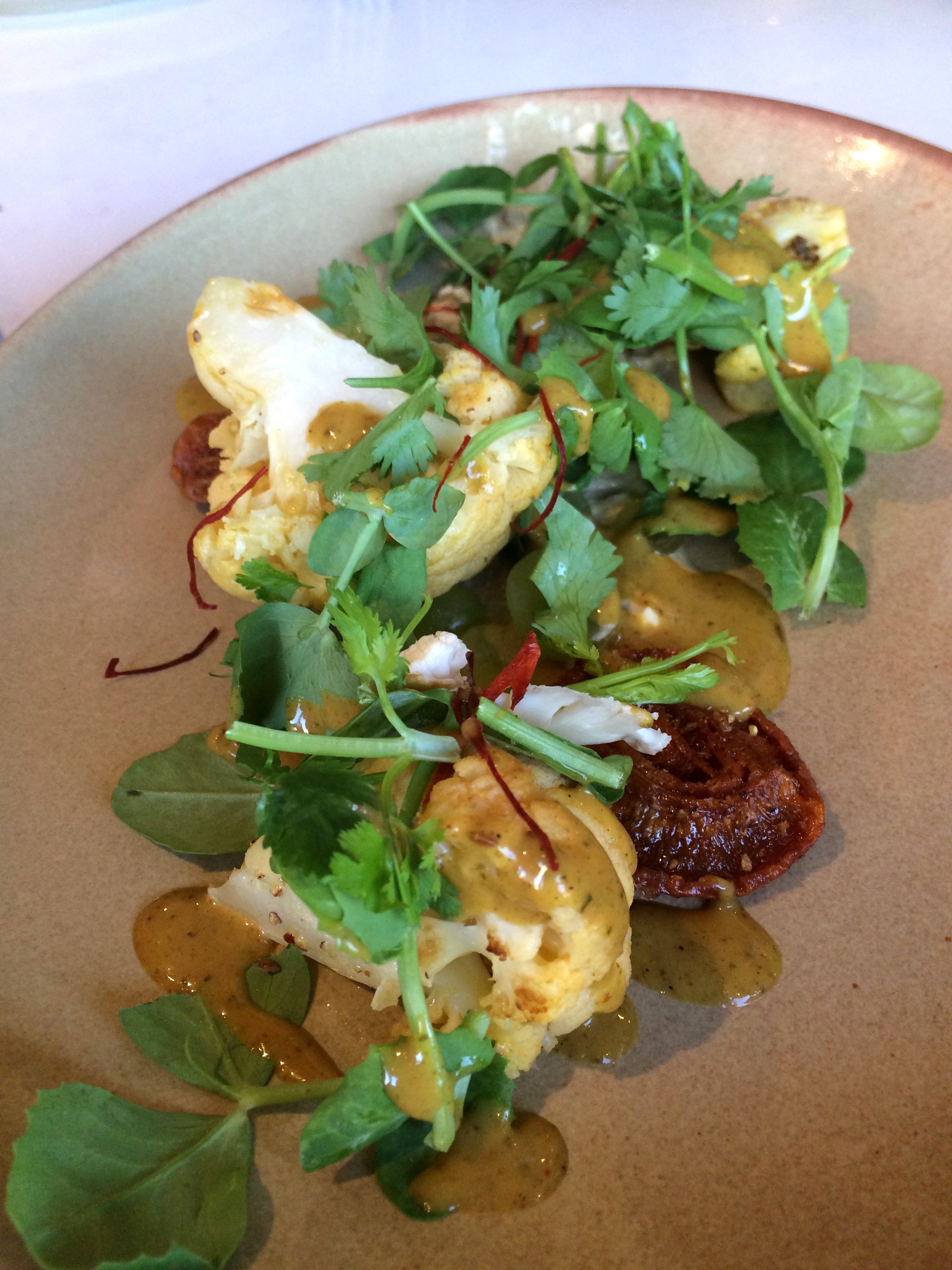 Posted on January 20, 2016 by Jacqui's Food Fetish Leave a comment Wood oven roasted cauliflower with cracked green wheat, dried apricot, almond gazpacho, grapes and tamarind masala dressing