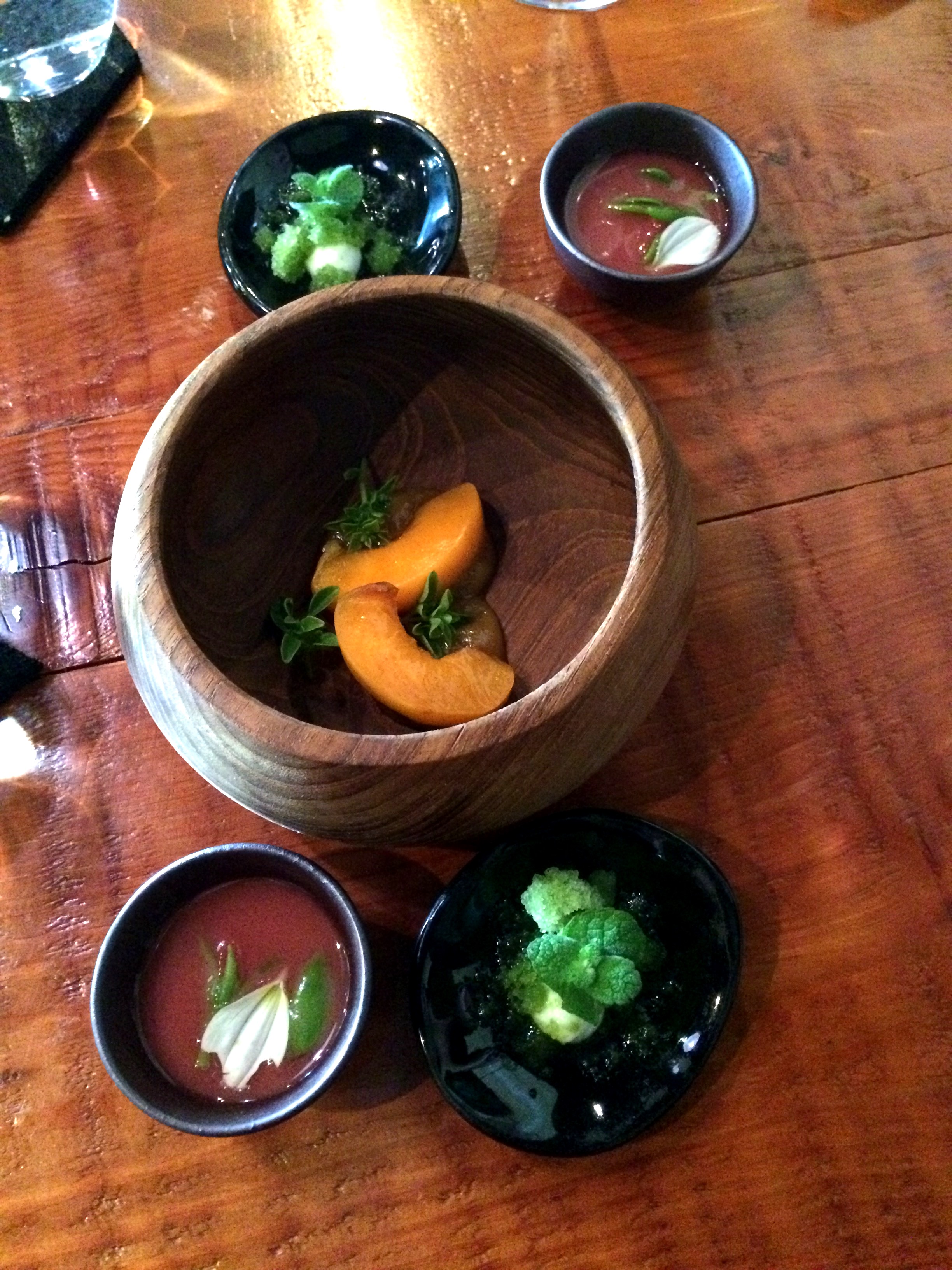 Posted on March 1, 2016 by Jacqui's Food Fetish Leave a comment Buttermilk gel, cucumber granita, mint leaves, Rhubarb consomme, baby sun rose, dahlia petals, Sous vide peach with basil syrup/leaves