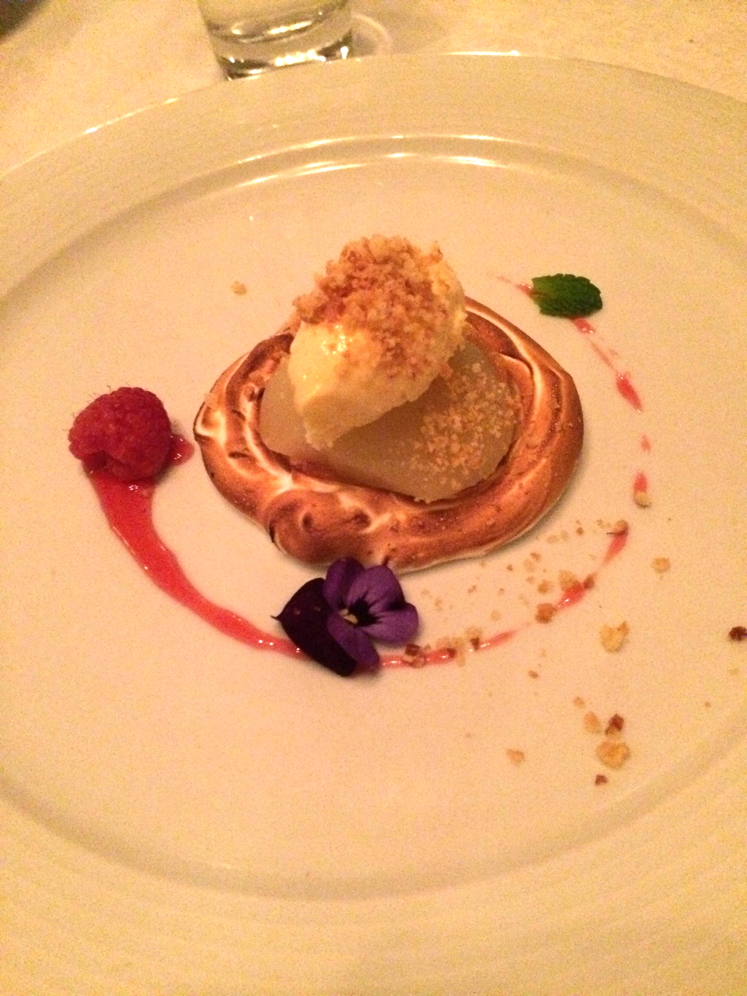 Posted on August 31, 2016 by Jacqui's Food Fetish Leave a comment Vanilla mascarpone, torched meringue, poached pear, almond crunch and liqueur-soaked sponge