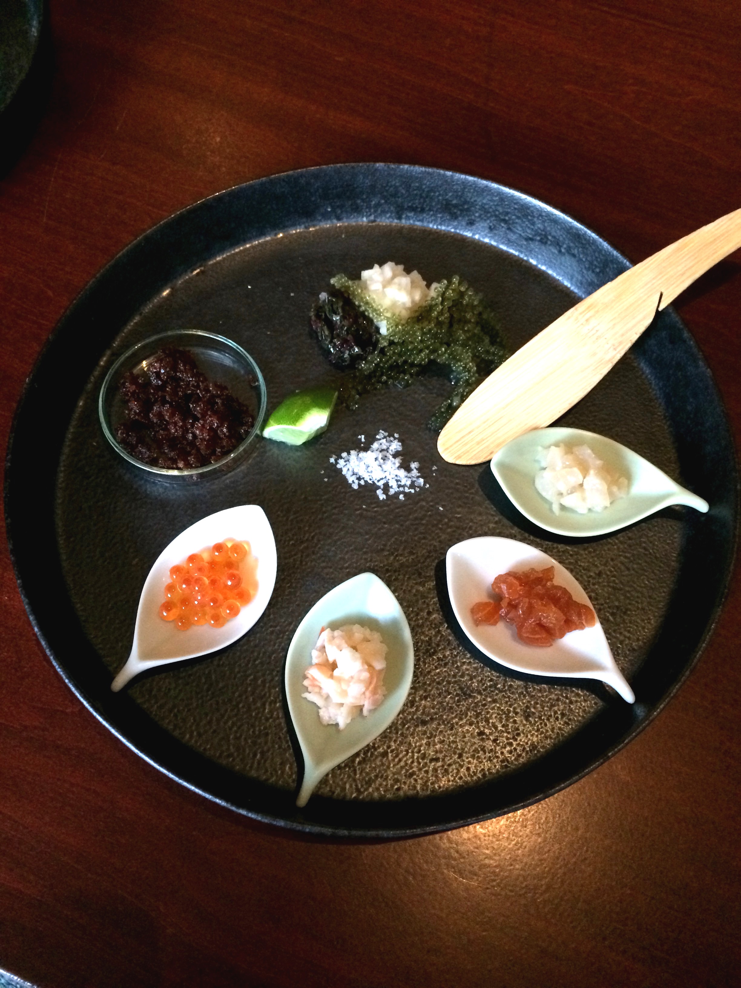 Posted on November 15, 2015 by Jacqui's Food Fetish Leave a comment Scallop, salmon, lobster, salmon roe, crunchy black rice, sea grape, nashi pear and konbu – mix up various combinations and enjoy!
