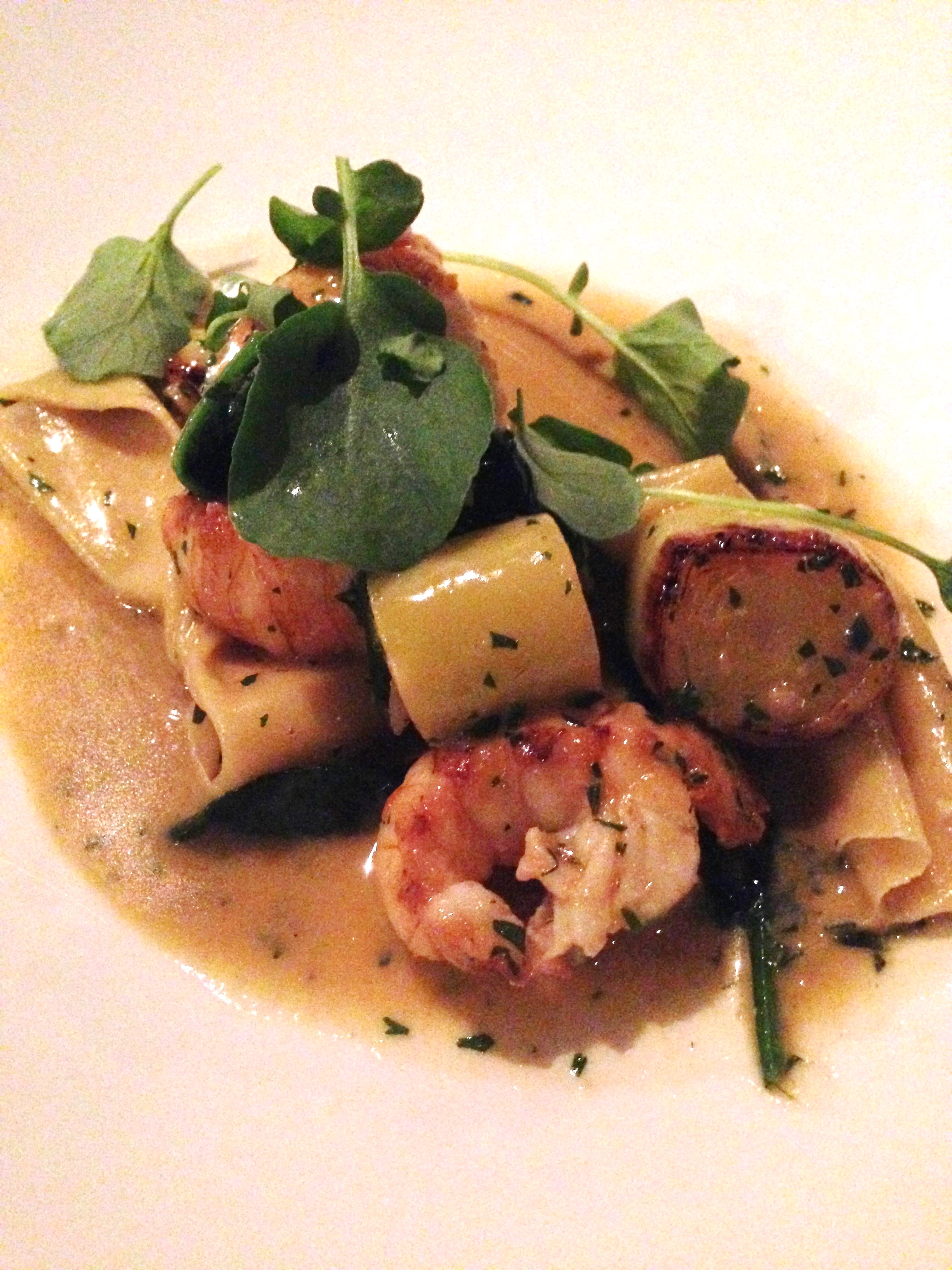 Posted on March 9, 2015 by Jacqui's Food Fetish Leave a comment Moreton Bay bugs, braised leeks, spinach, whole egg fazzoletti, shellfish butter
