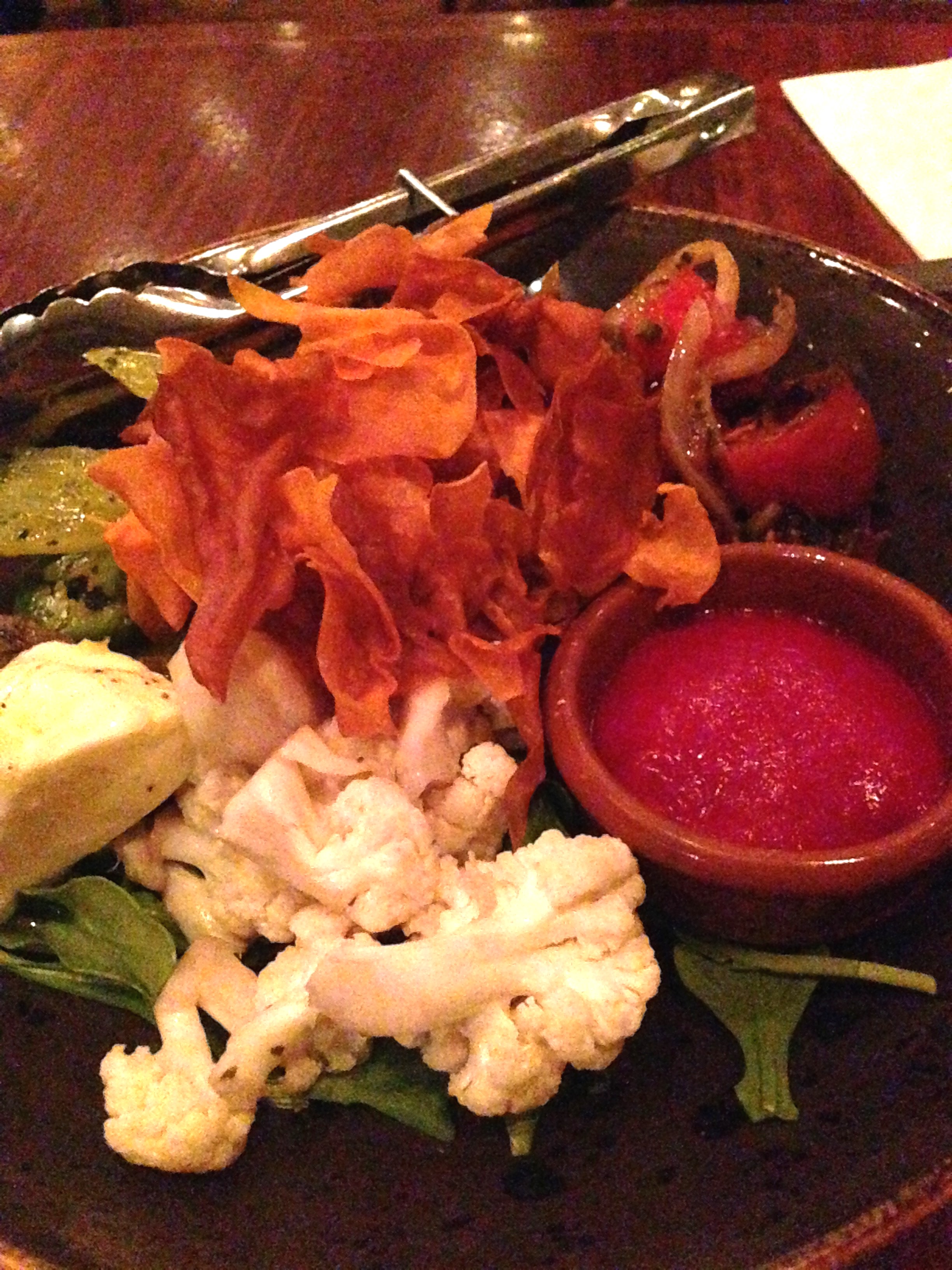 Posted on April 9, 2015 by Jacqui's Food Fetish Leave a comment Sweet potato crisps, roasted & grilled seasonal vegetables & caponata, buffalo ricotta & beetroot puree